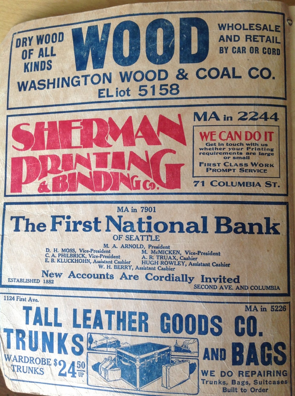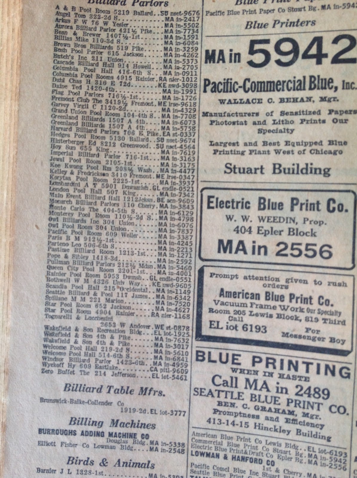 Note the billard parlor listed at 4326 University Way. This pleasant and healthful concern was quickly evicted to make way for the first off-campus digs of the Associated Students of the University of Washington's book store, who have squatted there ever since.
